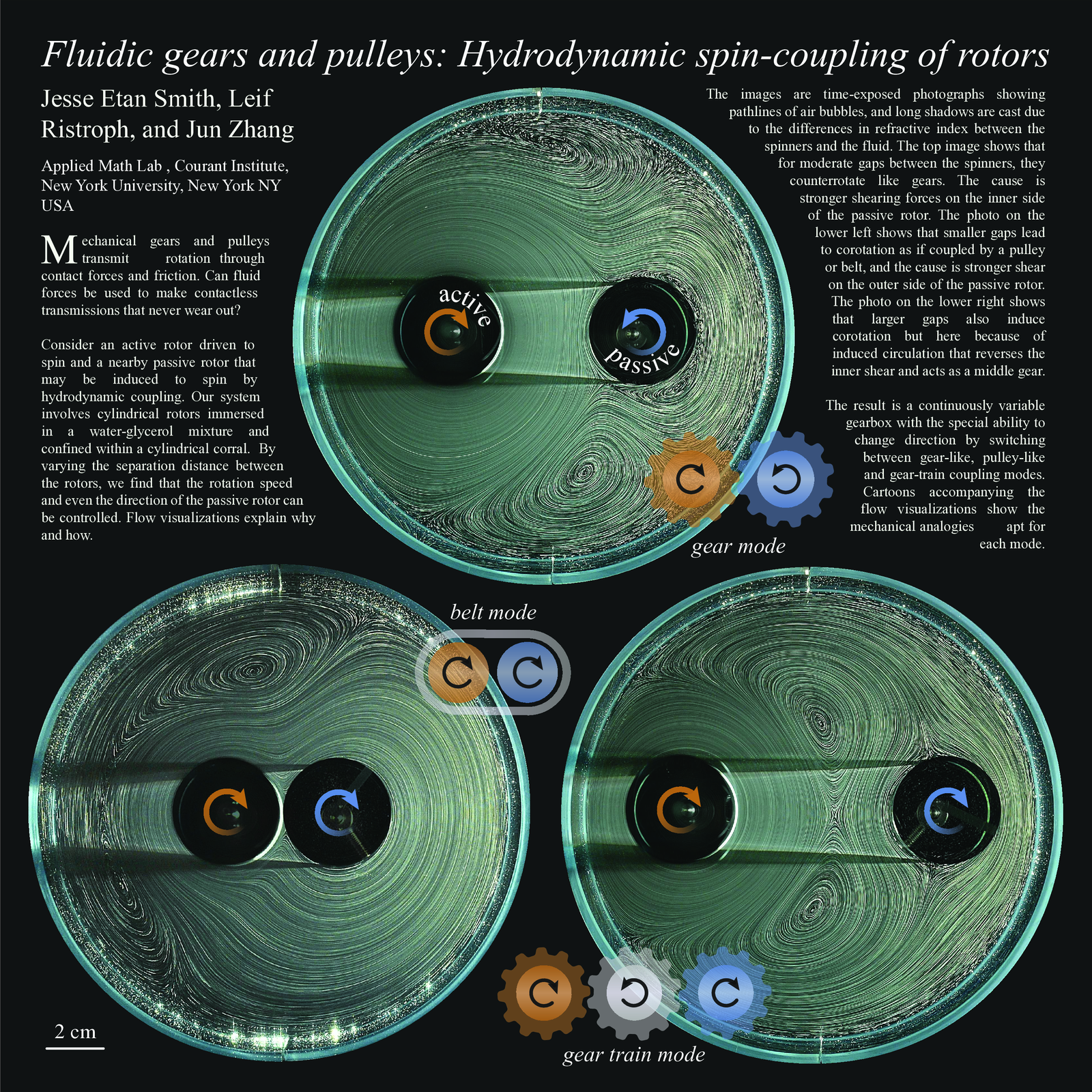 Mechanical gears and pulleys transmit rotation through contact forces and friction. Can fluid forces be used to make contactless transmissions that never wear out?Consider an active rotor driven to spin and a nearby passive rotor that may be induced to spin by hydrodynamic coupling. Our system involves cylindrical rotors immersed in a water-glycerol mixture and confined within a cylindrical corral. By varying the separation distance between the rotors, we find that the rotation speed and even the direction of the passive rotor can be controlled. Flow visualizations explain why and how.The images are time-exposed photographs showing pathlines of air bubbles, and long shadows are cast due to the differences in refractive index between the spinners and the fluid. The top image shows that for moderate gaps between the spinners, they counterrotate like gears. The cause is stronger shearing forces on the inner side of the passive rotor. The photo on the lower left shows that smaller gaps lead to corotation as if coupled by a pulley or belt, and the cause is stronger shear on the outer side of the passive rotor. The photo on the lower right shows that larger gaps also induce corotation but here because of induced circulation that reverses the inner shear and acts as a middle gear.The result is a continuously variable gearbox with the special ability to change direction by switching between gear-like, pulley-like and gear-train coupling modes. Cartoons accompanying the flow visualizations show the mechanical analogies apt for each mode.