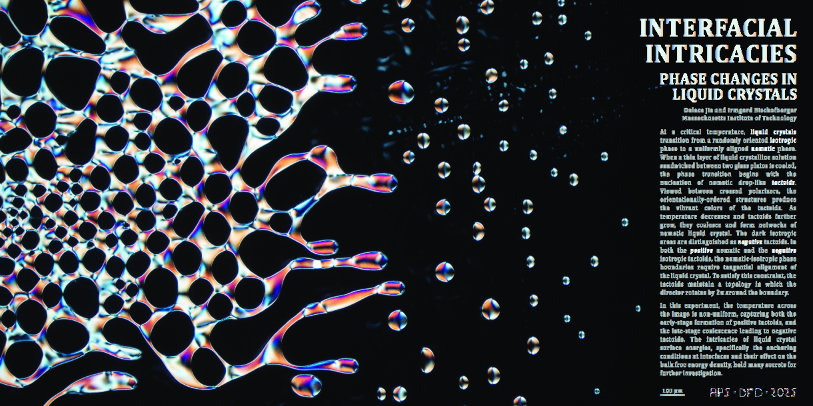 At a critical temperature, liquid crystals transition from a randomly oriented isotropic phase to a uniformly aligned nematic phase. When a thin layer of liquid crystalline solution sandwiched between two glass plates is cooled, the phase transition begins with the nucleation of nematic drop-like tactoids. Viewed between crossed polarizers, the orientationally-ordered structures produce the vibrant colors of the tactoids. As temperature decreases and tactoids further grow, they coalesce and form networks of nematic liquid crystal. The dark isotropic areas are distinguished as negative tactoids. In both the positive nematic and the negative isotropic tactoids, the nematic-isotropic phase boundaries require tangential alignment of the liquid crystal. To satisfy this constraint, the tactoids maintain a topology in which the director rotates by 2π around the boundary.In this experiment, the temperature across the image is non-uniform, capturing both the early-stage formation of positive tactoids and the late-stage coalescence leading to negative tactoids. The intricacies of liquid crystal surface energies, specifically the anchoring conditions at interfaces and their effect on the bulk free energy density, hold many secrets for further investigation.
