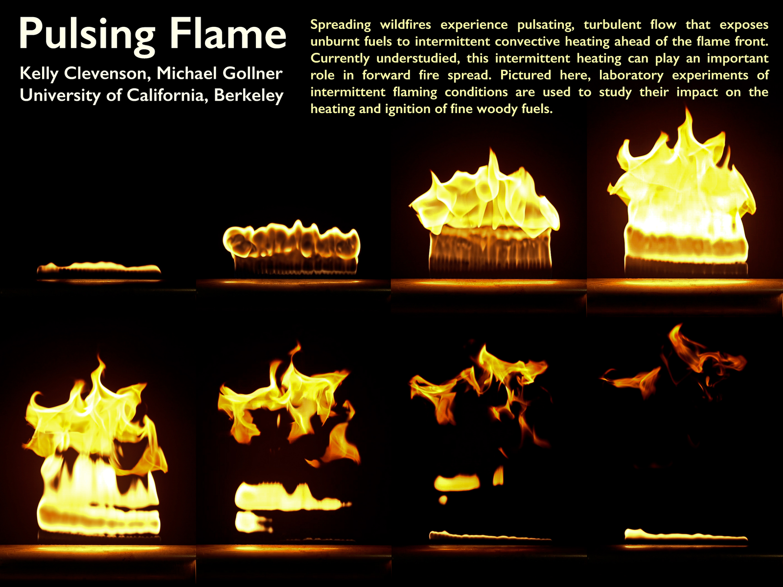 Spreading wildfires experience pulsating, turbulent flow that exposes unburnt fuels to intermittent convective heating ahead of the flame front. Currently understudied, this intermittent heating can play an important role in forward fire spread. Pictured here, laboratory experiments of intermittent flaming conditions are used to study their impact on the heating and ignition of fine woody fuels.
