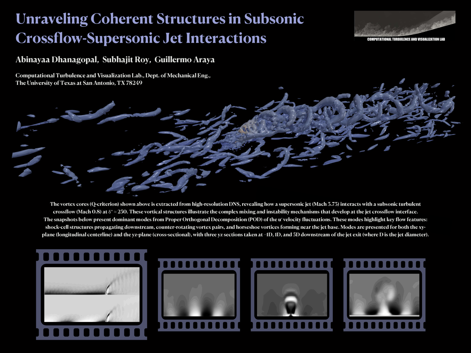 The vortex cores (Q-criterion) shown is extracted from high-resolution DNS, revealing how a supersonic jet (Mach 3.73) interacts with a subsonic turbulent crossflow (Mach 0.8) at δ⁺ ≈ 250. These vortical structures illustrate the complex mixing and instability mechanisms that develop at the jet crossflow interface.The snapshots present dominant modes from Proper Orthogonal Decomposition (POD) of the u′ velocity fluctuations. These modes highlight key flow features: shock-cell structures propagating downstream, counter-rotating vortex pairs, and horseshoe vortices forming near the jet base. Modes are presented for both the xy-plane (longitudinal centerline) and the yz-plane (cross-sectional), with three yz sections taken at −1D, 1D, and 5D downstream of the jet exit (where D is the jet diameter).