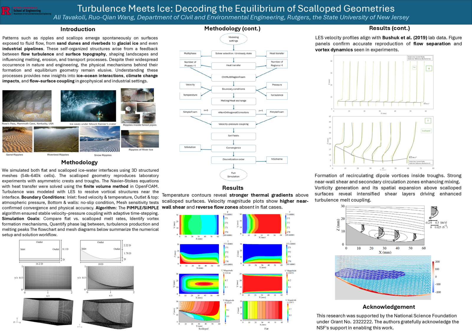 Patterns such as ripples and scallops emerge on surfaces exposed to fluid flow from glaciers to industrial pipelines driven by interactions between turbulence, heat transfer, and evolving topography. Using high-resolution Large Eddy Simulations (LES) in OpenFOAM, we reveal how scalloped ice water interfaces reorganize turbulence, forming relief-locked dipole vortices that anchor within troughs and drive enhanced melting.Comparisons between flat and scalloped geometries show that scallops intensify near-wall shear, produce stronger thermal gradients, and increase melt rates by nearly 80% relative to flat interfaces. Validation against laboratory experiments confirms the accuracy of vortex dynamics, velocity profiles, and turbulence melt phase shifts.The results provide a quantitative framework linking interface morphology, vortex generation, and heat transfer, offering new insights into ice ocean interactions and climate modeling. The visuals highlight vortex formation, flow separation, and turbulence melt coupling with striking clarity.
