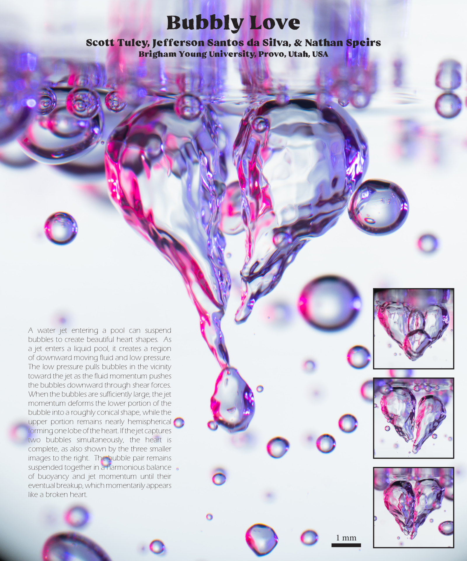 A water jet entering a pool can suspend bubbles to create beautiful heart shapes. As a jet enters a liquid pool, it creates a region of downward moving fluid and low pressure. The low pressure pulls bubbles in the vicinity toward the jet as the fluid momentum pushes the bubbles downward through shear forces. When the bubbles are sufficiently large, the jet momentum deforms the lower portion of the bubble into a roughly conical shape, while the upper portion remains nearly hemispherical forming one lobe of the heart. If the jet captures two bubbles simultaneously, the heart is complete, as also shown by the three smaller images to the right. The bubble pair remains suspended together in a harmonious balance of buoyancy and jet momentum until their eventual breakup, which momentarily appears like a broken heart.
