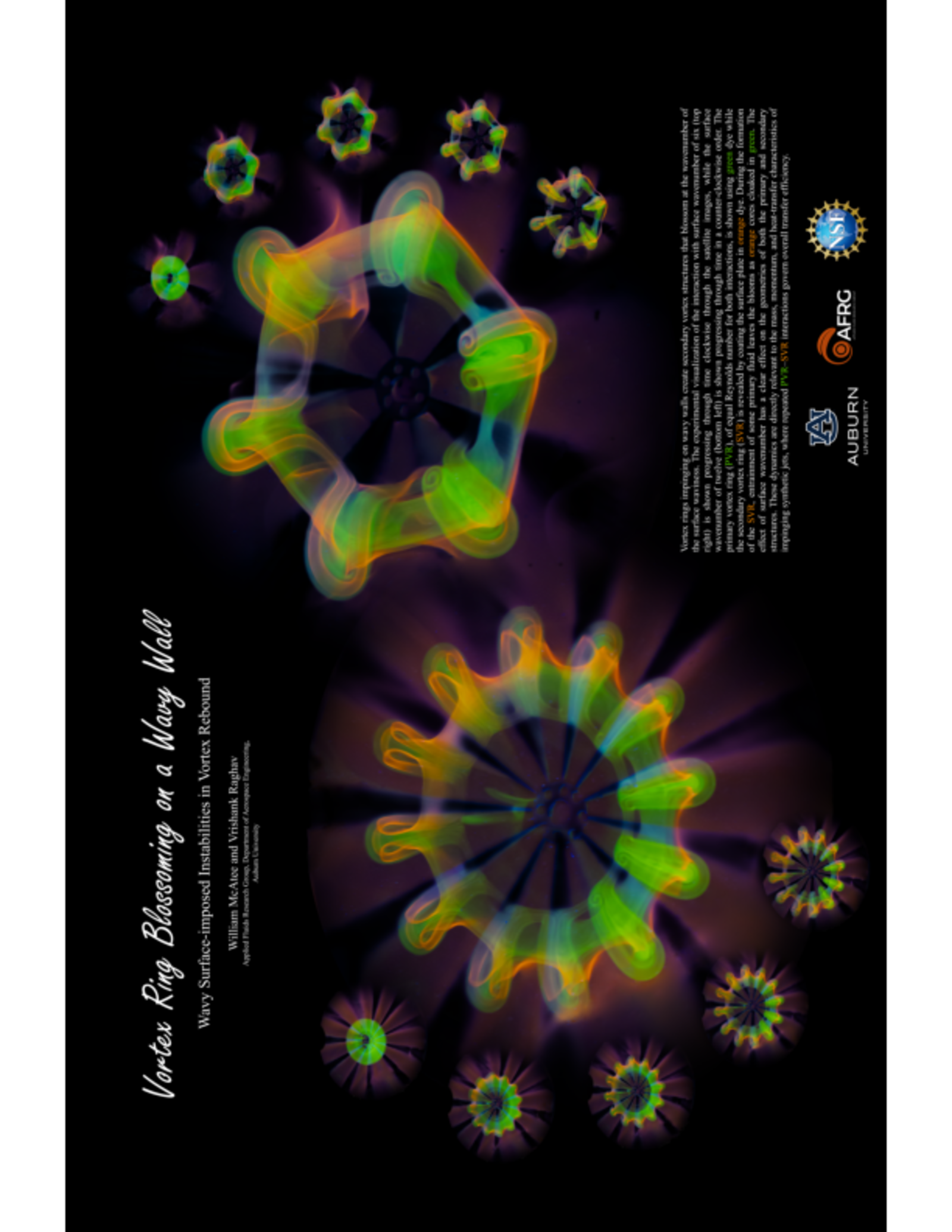 Vortex rings impinging on wavy walls create secondary vortex structures that blossom at the wavenumber of the surface waviness. The experimental visualization of the interaction with surface wavenumber of six (top right) is shown progressing through time clockwise through the satellite images, while the surface wavenumber of twelve (bottom left) is shown progressing through time in a counter-clockwise order. The primary vortex ring (PVR), of equal Reynolds number for both interactions, is shown using green dye while the secondary vortex ring (SVR) is revealed by coating the surface plate in orange dye. During the formation of the SVR, entrainment of some primary fluid leaves the blooms as orange cores cloaked in green. The effect of surface wavenumber has a clear effect on the geometries of both the primary and secondary structures. These dynamics are directly relevant to the mass, momentum, and heat-transfer characteristics of impinging synthetic jets, where repeated PVR-SVR interactions govern overall transfer efficiency.